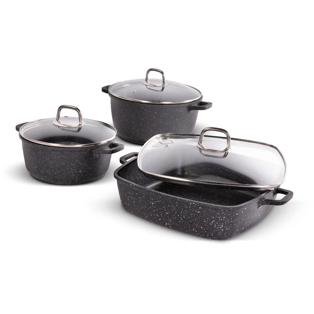 Vasele sunt echipate cu suprafață neadezivă rezistentă la zgârieturi și arsuri, fund gros cu mânere foarte elegante pentru o mai mare siguranță, funcționalitate și confort.